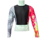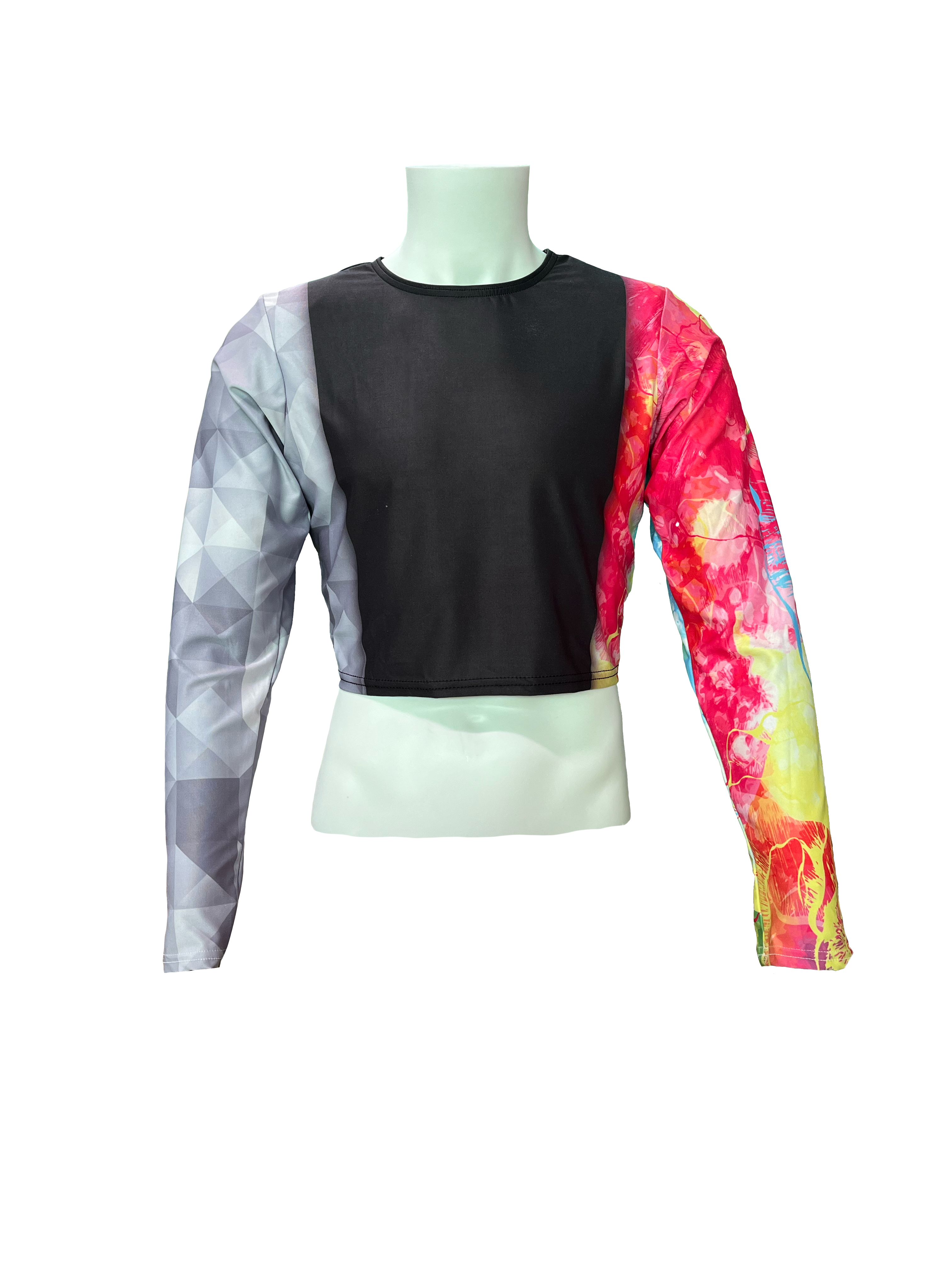 Stand out on and off the field with this striking color guard performance shirt. Designed for movement and flair, the shirt features a sleek black base complemented by asymmetrical sleeves—one in solid grey for balance, and the other bursting with personality in vibrant pink and yellow splatter. Perfect for showcasing individuality while maintaining team cohesion, this shirt blends comfort, durability, and style to help you perform your best, every spin and step of the way.