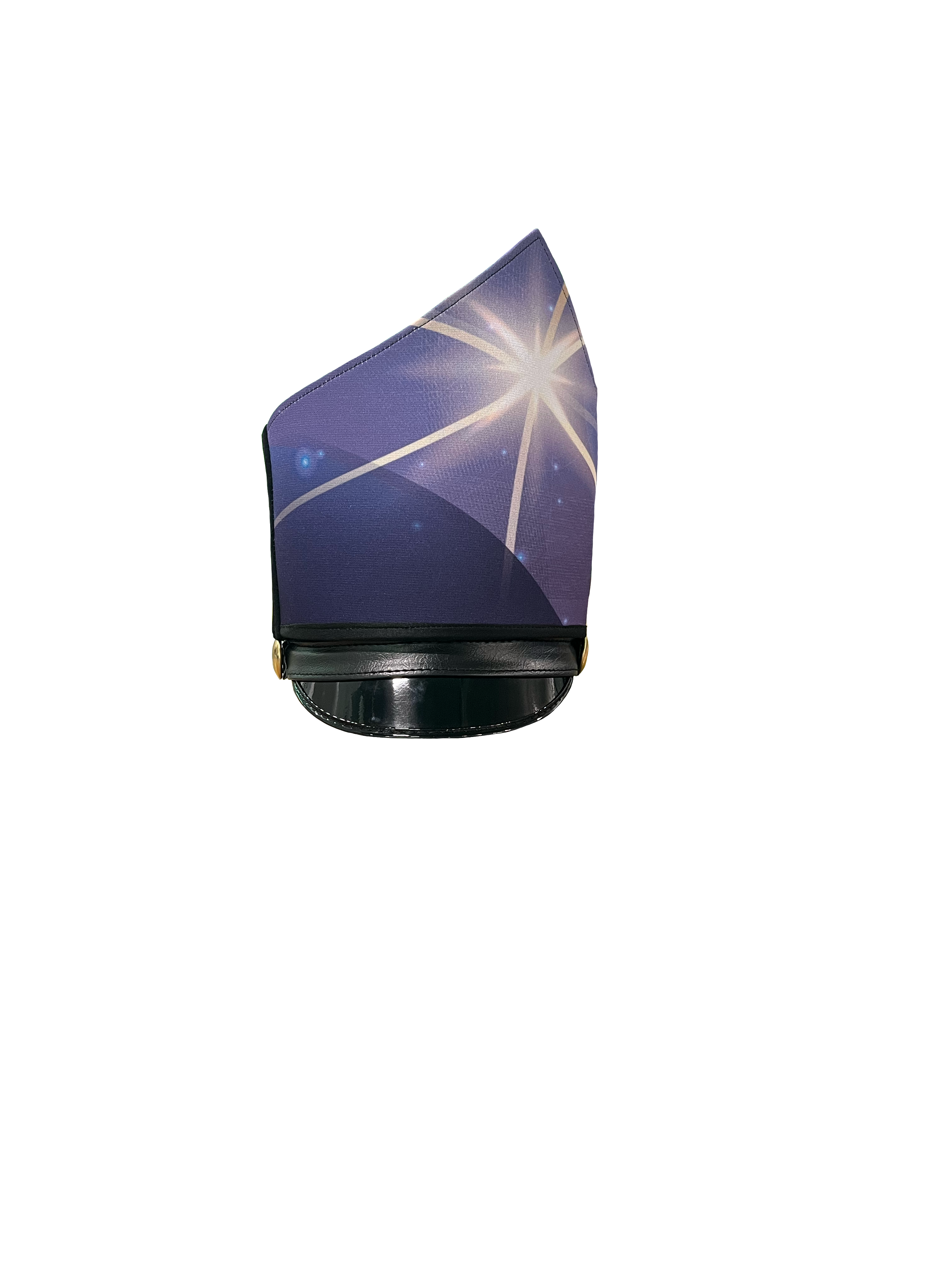 Add a vibrant pop of color and style to your uniform with our one of our shako wraps. Featuring a stunning, eye-catching starburst design in rich purple hues, this wrap is the perfect way to elevate the look of your uniforms. Crafted with durability and comfort in mind, it’s designed to fit most shakos seamlessly and securely. The elastic back band ensures a snug fit, making it easy to slip on and off without hassle. Whether for marching band, color guard, or any performance group, this shako wrap will help you stand out in the crowd with a bold and dynamic appearance. Shako base not included.