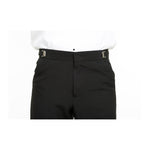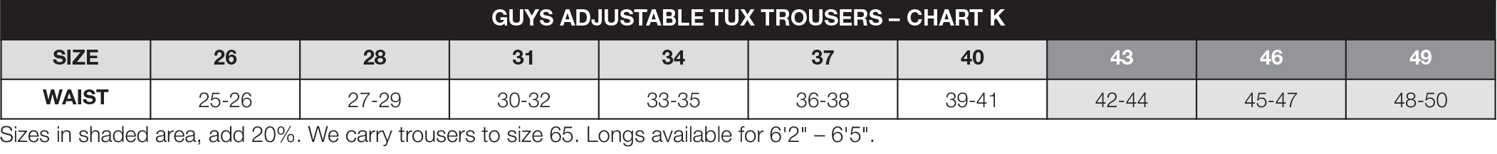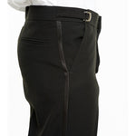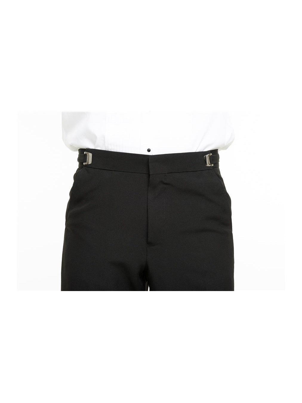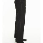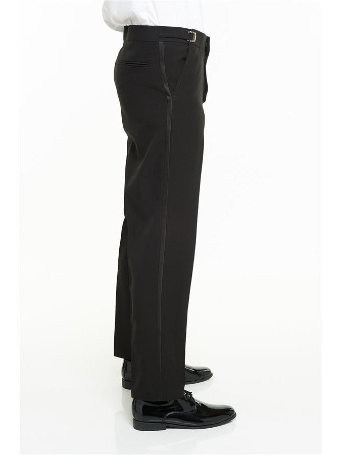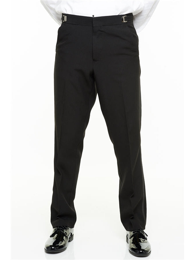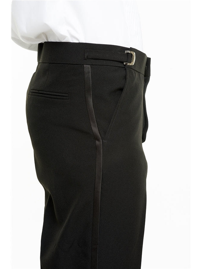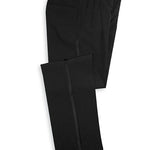 Polyester Tuxedo Pant. Adjustable waist. Satin stripe down side seams.