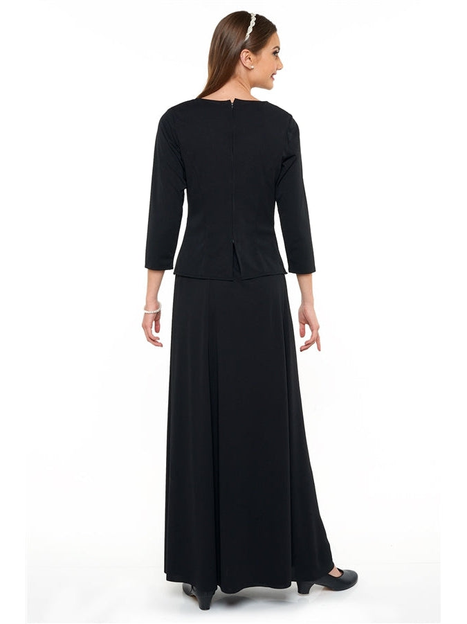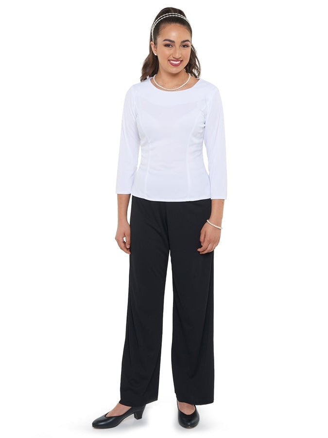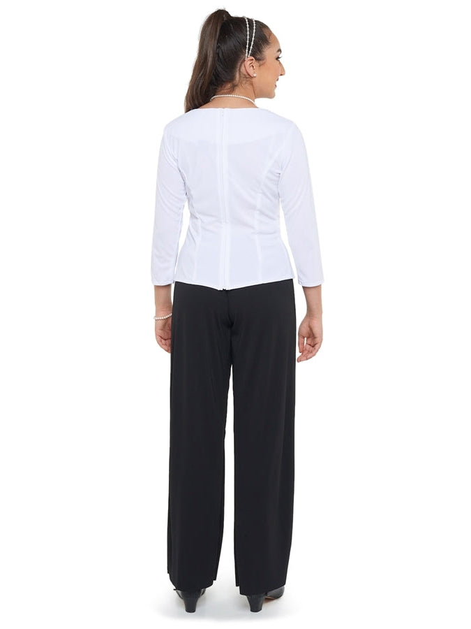 High scoop neckline, 3/4 sleeve princess seamed blouse. Features a separating back zipper. Made in wrinkle resistant, easy care matte jersey stretch knit.