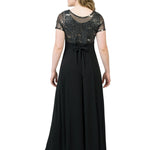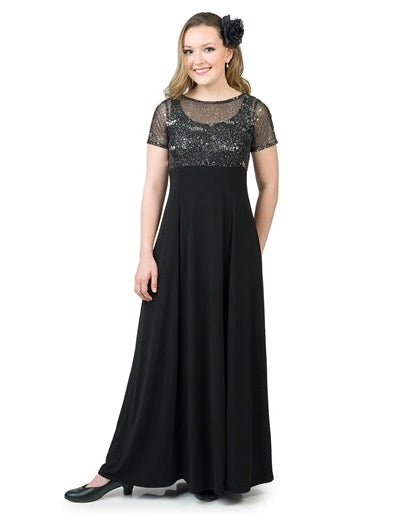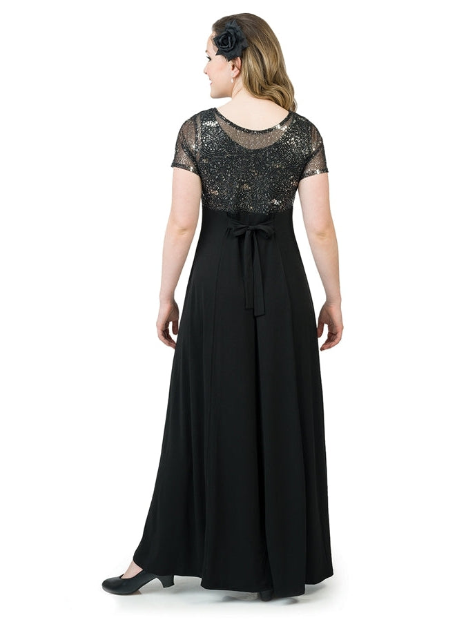 Boat neck, short sleeve illusion silver sequin and glitter stretch mesh bodice floor length gown. Skirt and tank top bodice lining are in solid spandex stretch knit. Features back ties and no back zipper.