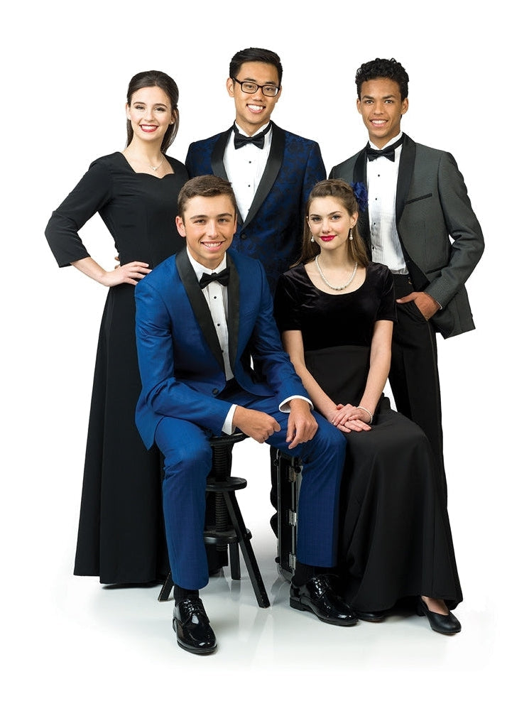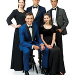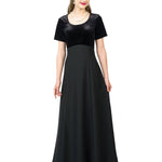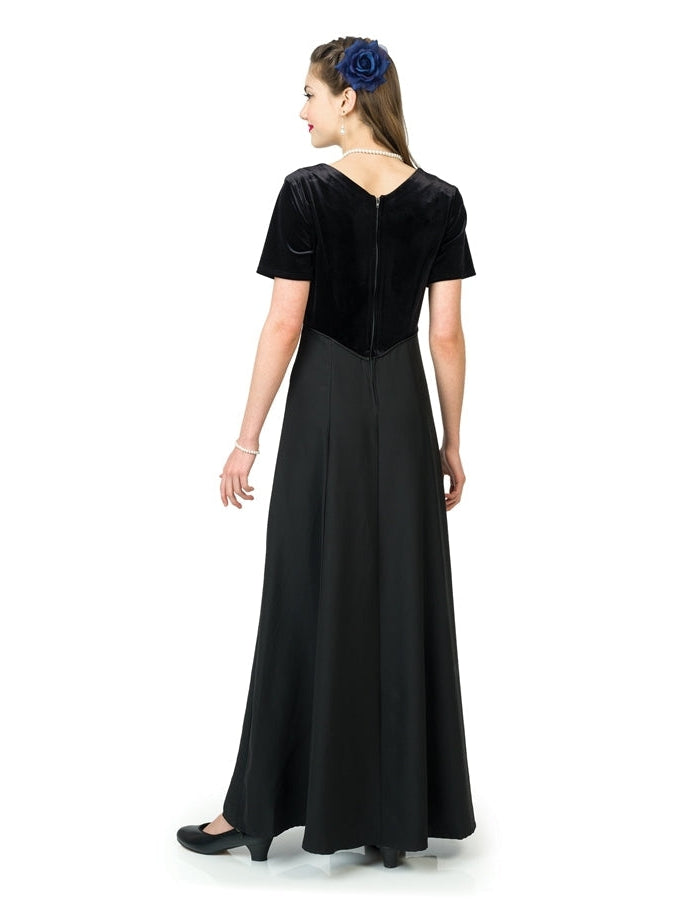 Scoop neck, short sleeve bodice in stretch velvet with empire waist with satin piping gradually curves down to the point in the back. Floor length skirt is in crepe fabric. Features back zipper.