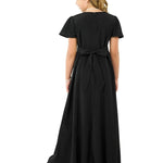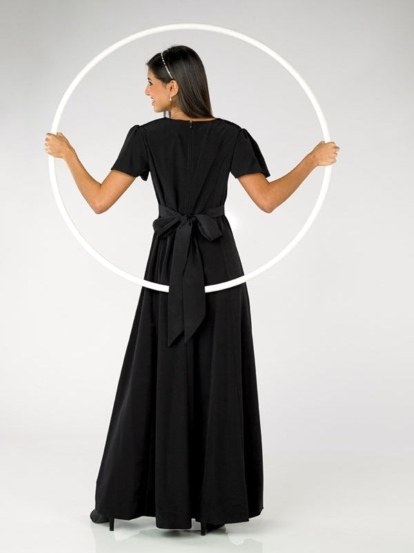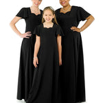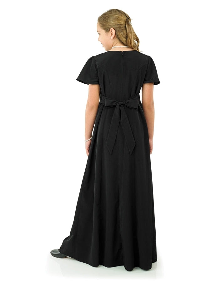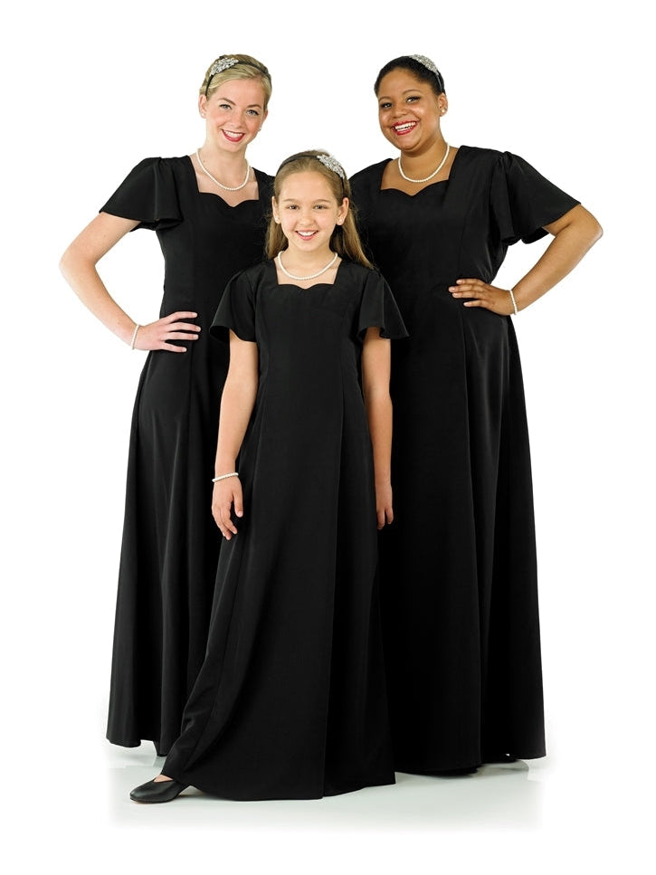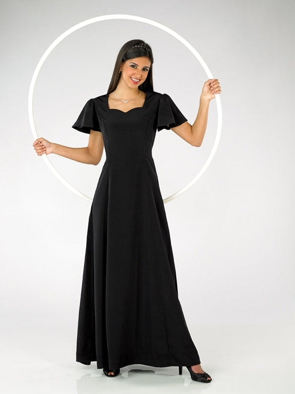 Sweetheart neck, flutter sleeve, floor length gown with princess seams. Features back ties and back zipper. Made in classic poly peach skin fabric.