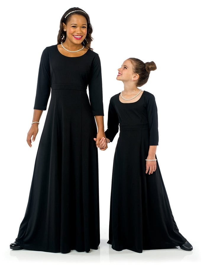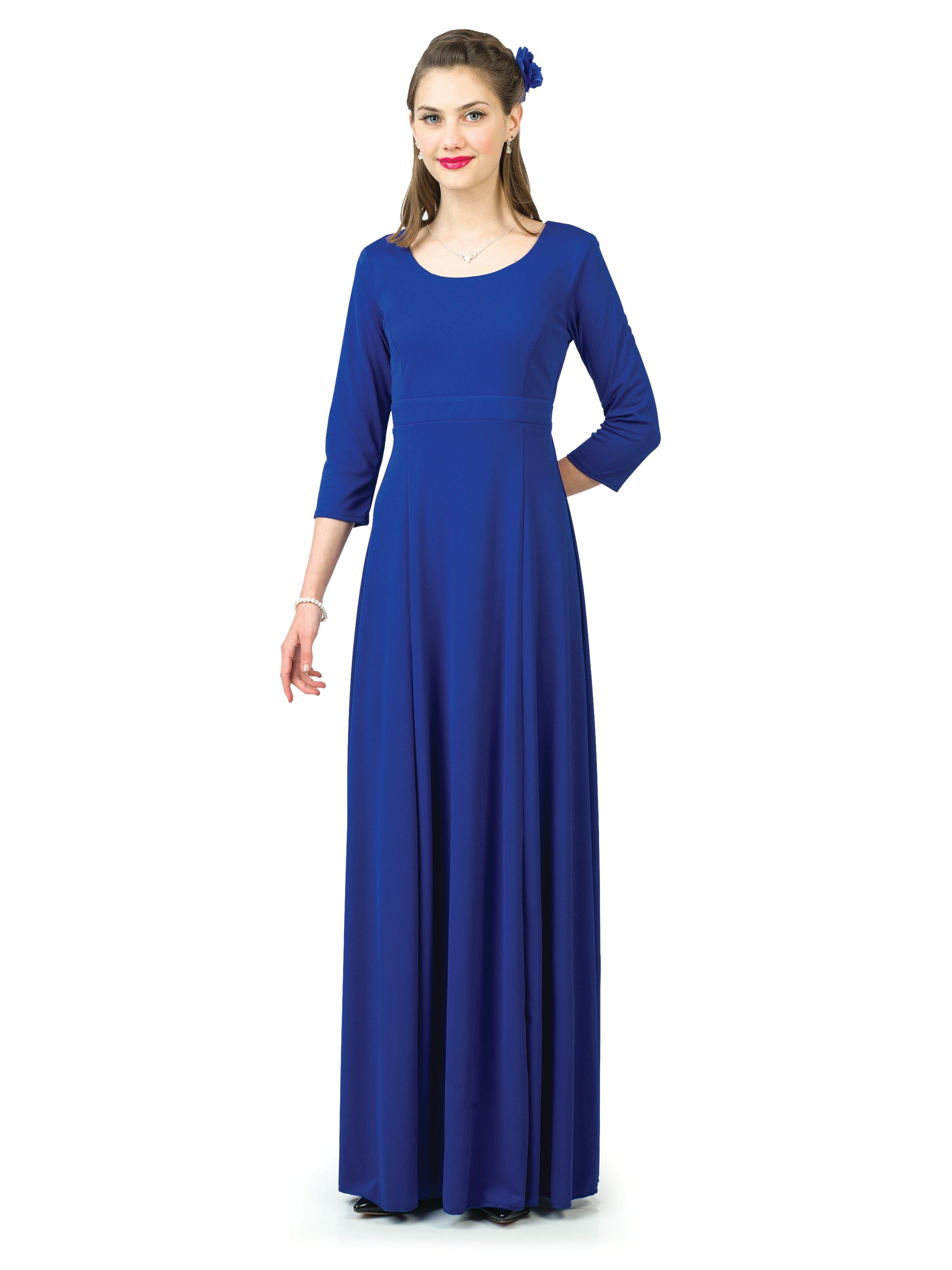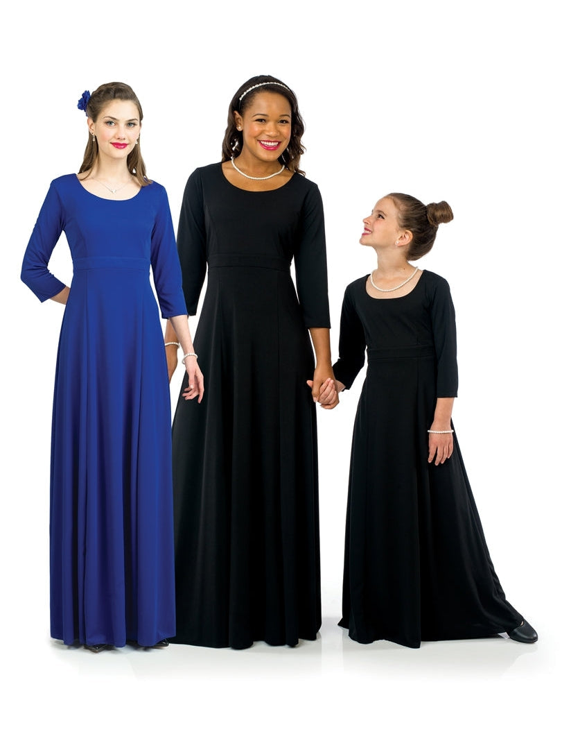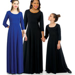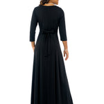Scoop neck, 3/4 sleeve, floor length gown with set-in-front empire waistband. Features back ties and no back zipper. Made in wrinkle resistant, easy care matte jersey stretch knit.