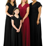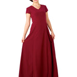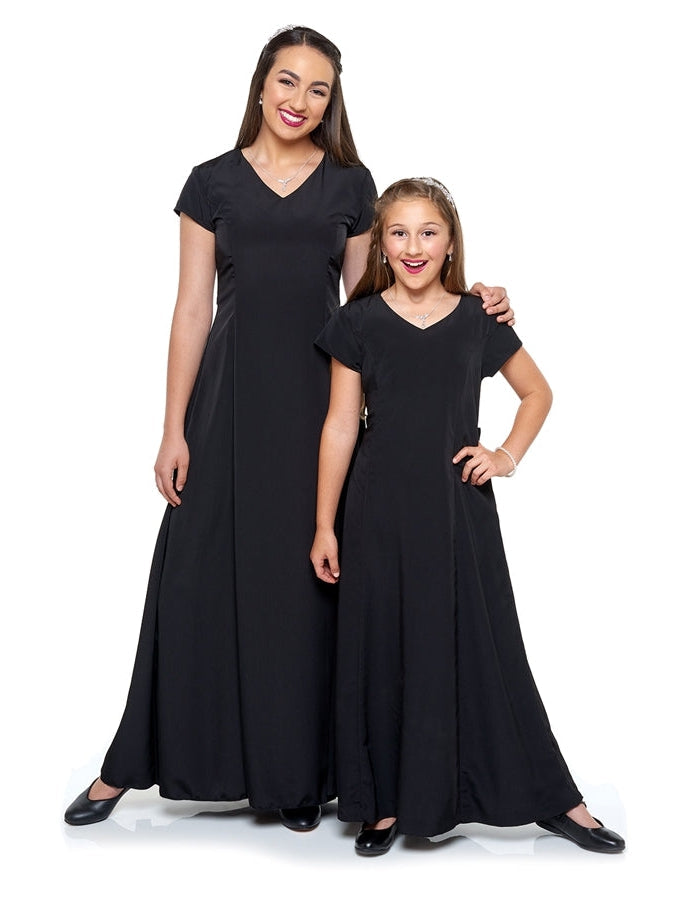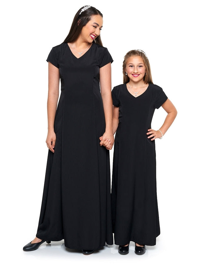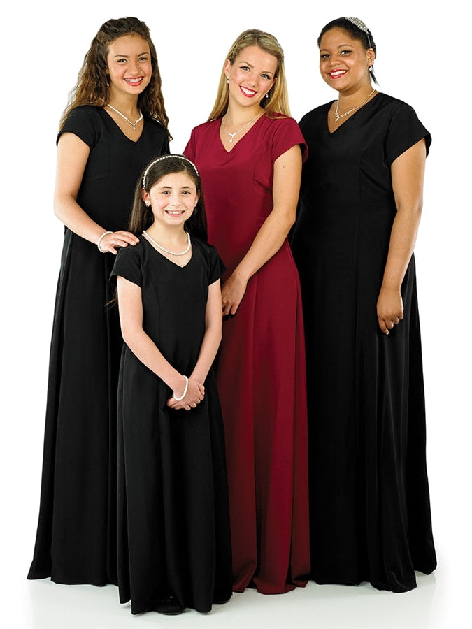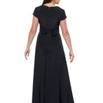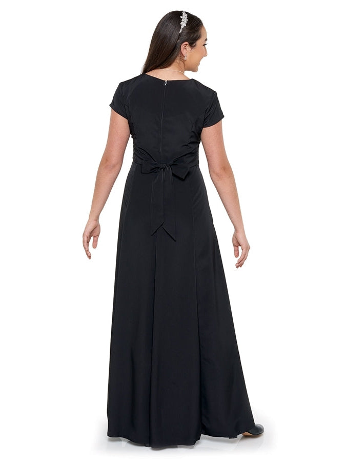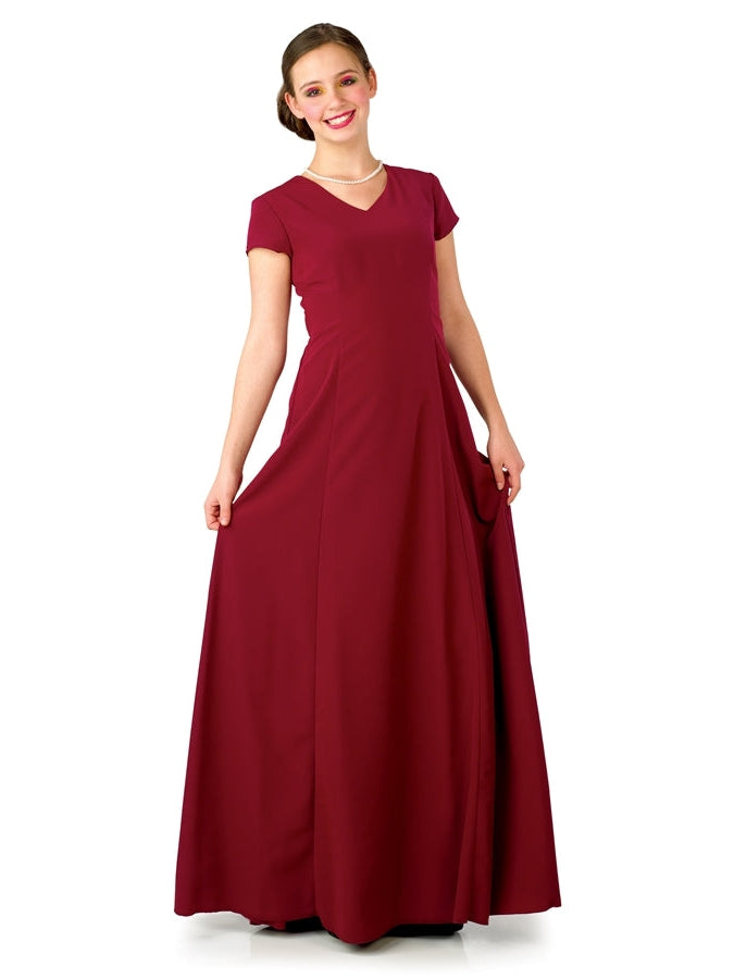 V-neckline, short cap sleeve, floor length gown with princess seams. Features back ties and back zipper. Made in classic poly peach skin fabric.