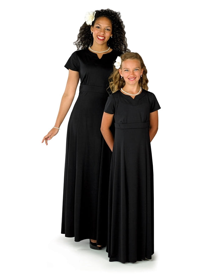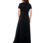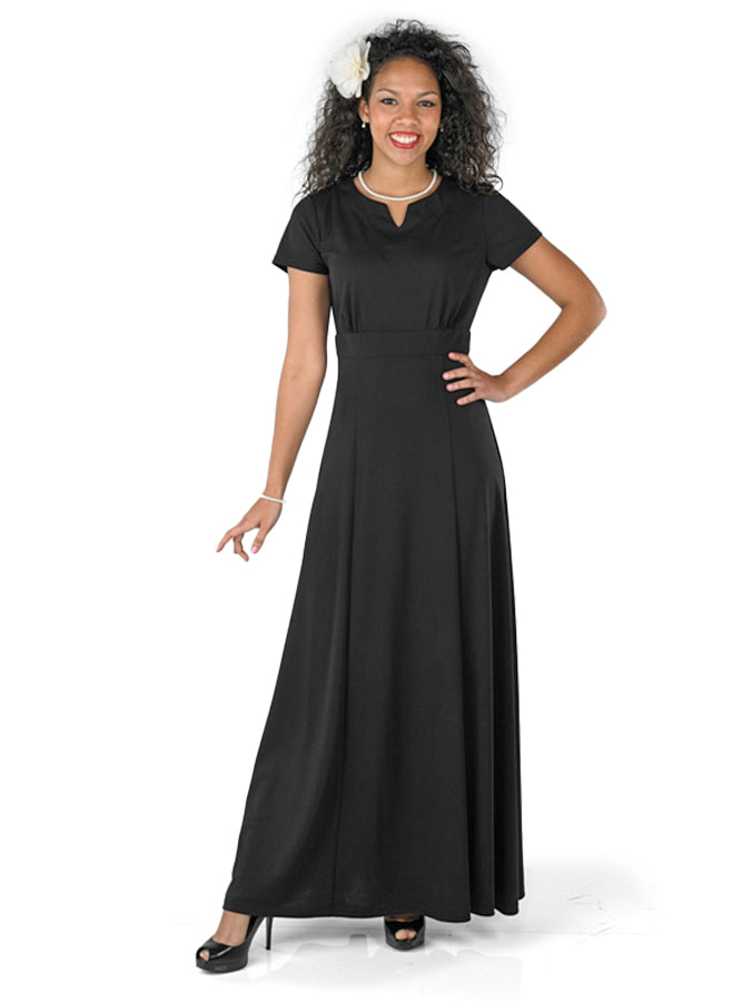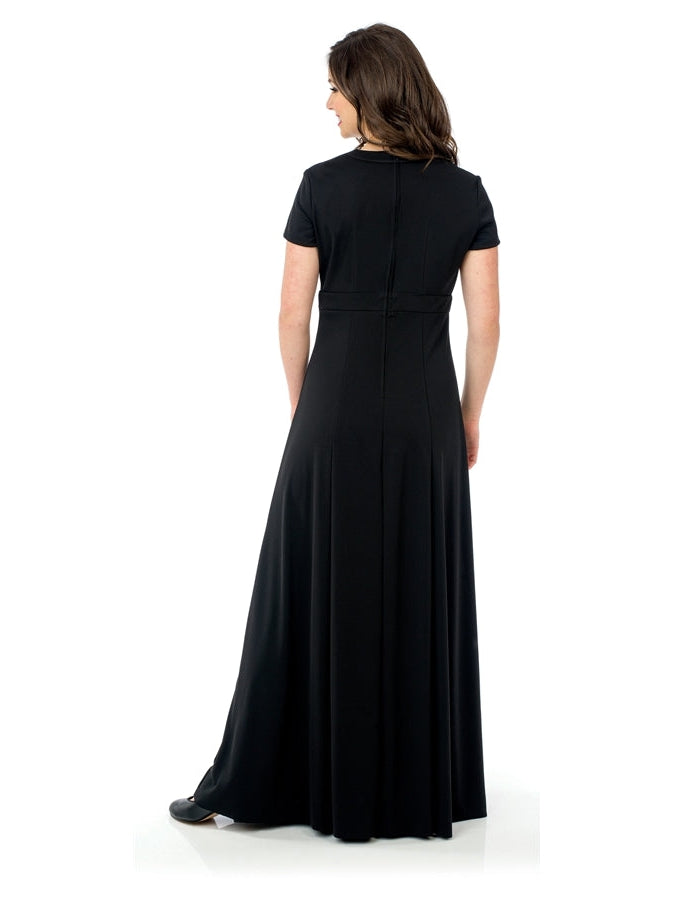 Crew V-notch neck, floor length gown with self-fabric accent. Fitted empire waistband and princess seam skirt in easy care matte jersey stretch knit. Back zipper.