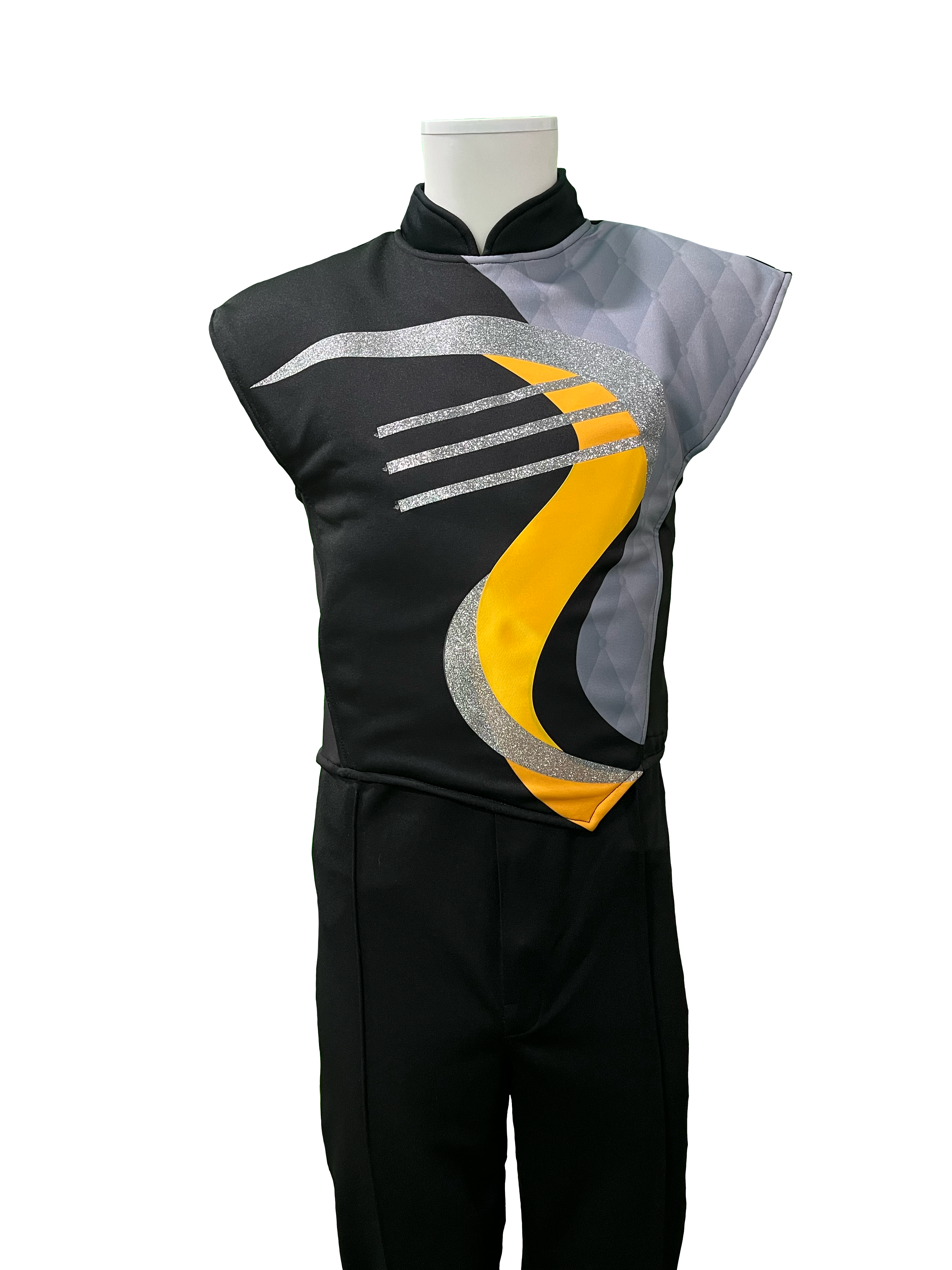 Stand out in style with this dynamic black, grey, and yellow marching band vest, designed to combine bold aesthetics with superior performance. The modern gradient design blends sharp contrasts of black and grey with vibrant yellow and accents, creating a sleek and energetic look that commands attention.