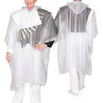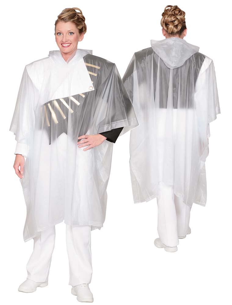 One size fits all. Soft, pliable PVC poncho with hood offers inexpensive protection for your uniforms.