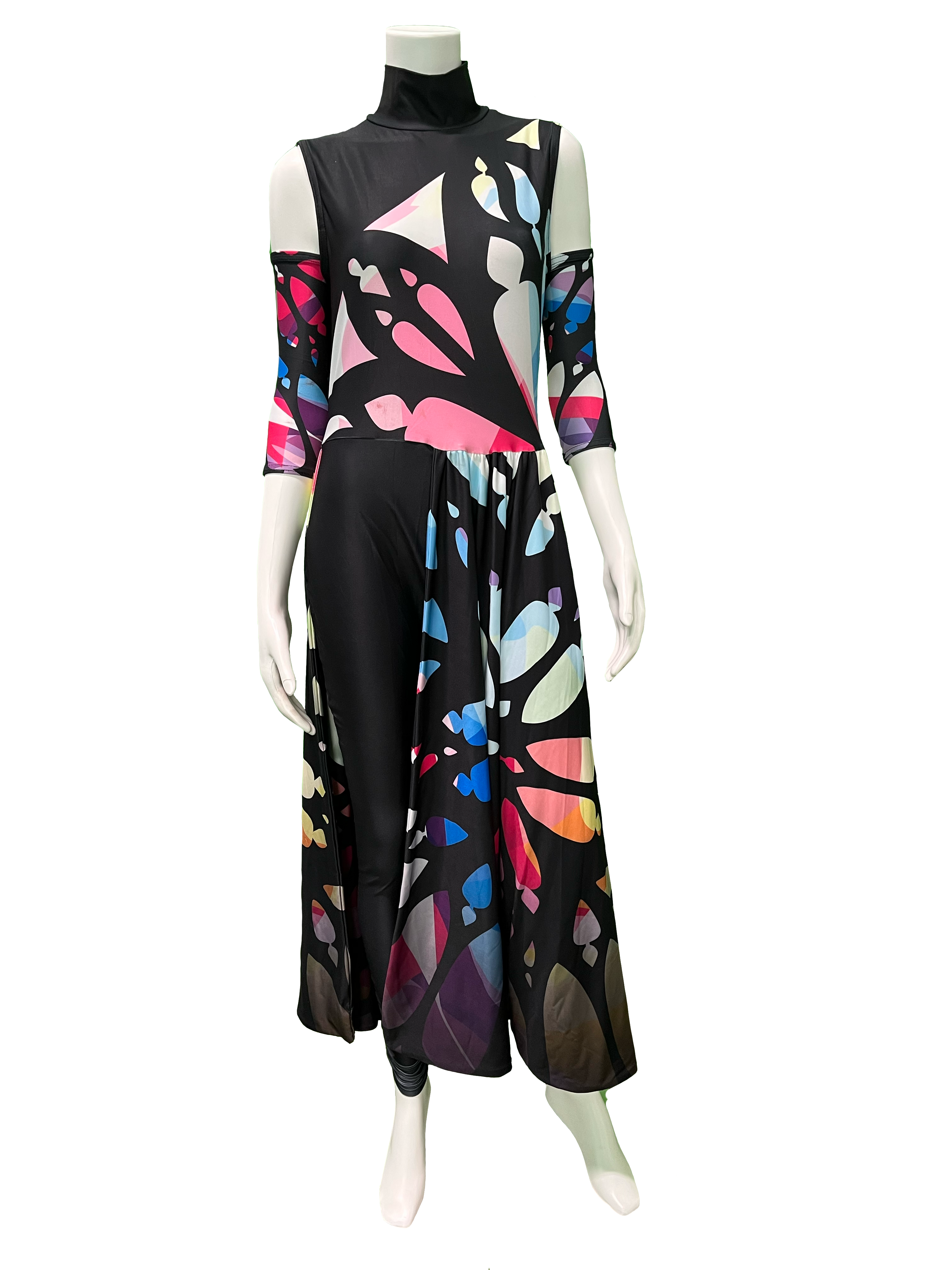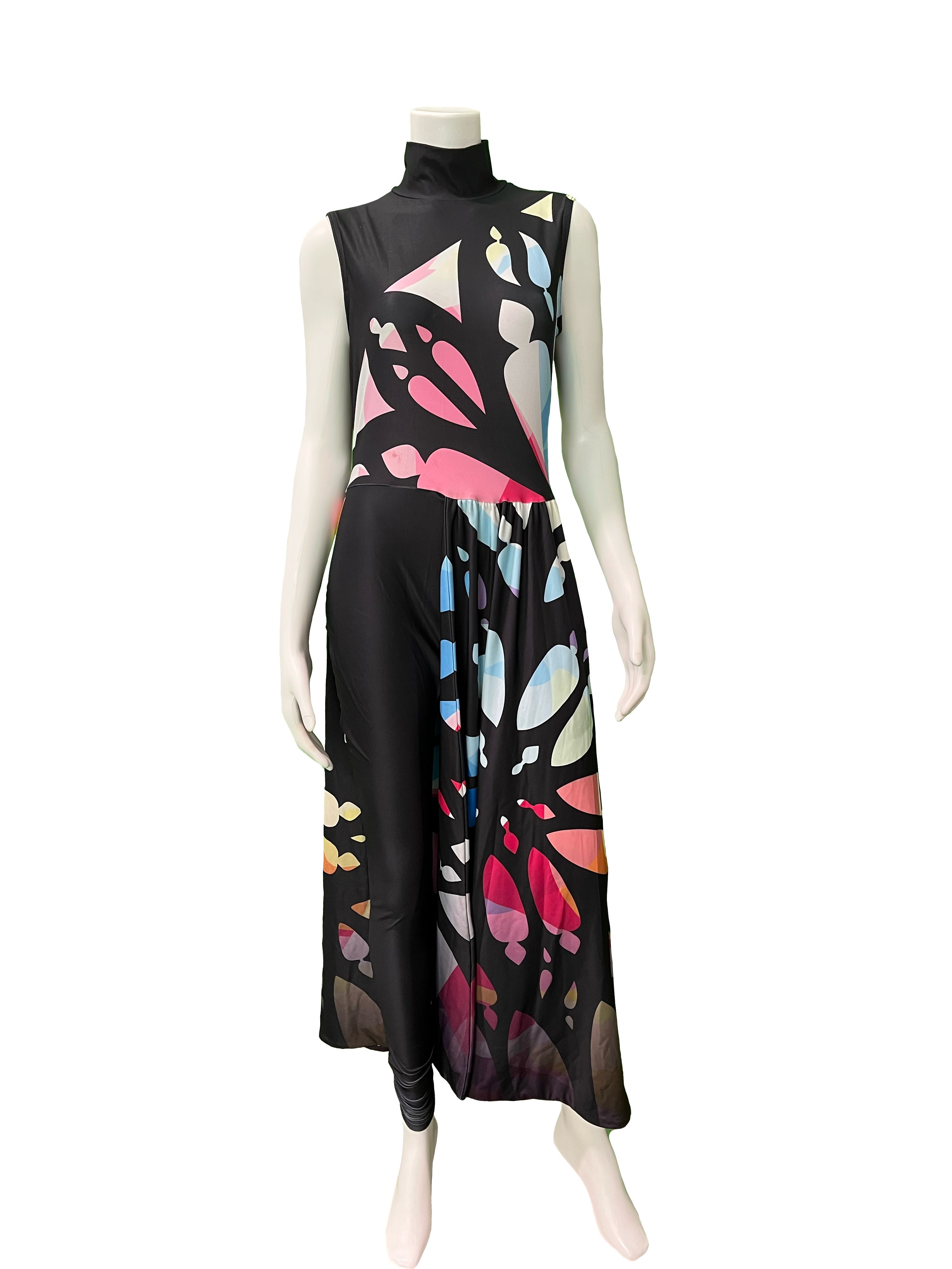 Unleash your artistic expression with this stunning sleeveless unitard, designed to captivate on and off the stage. Featuring a bold black base, this piece is brought to life by a dazzling multi-color stained glass design that adds a dynamic, intricate touch to your performance. The vibrant colors and geometric patterns evoke the beauty and complexity of stained glass, creating a mesmerizing visual effect as you move.