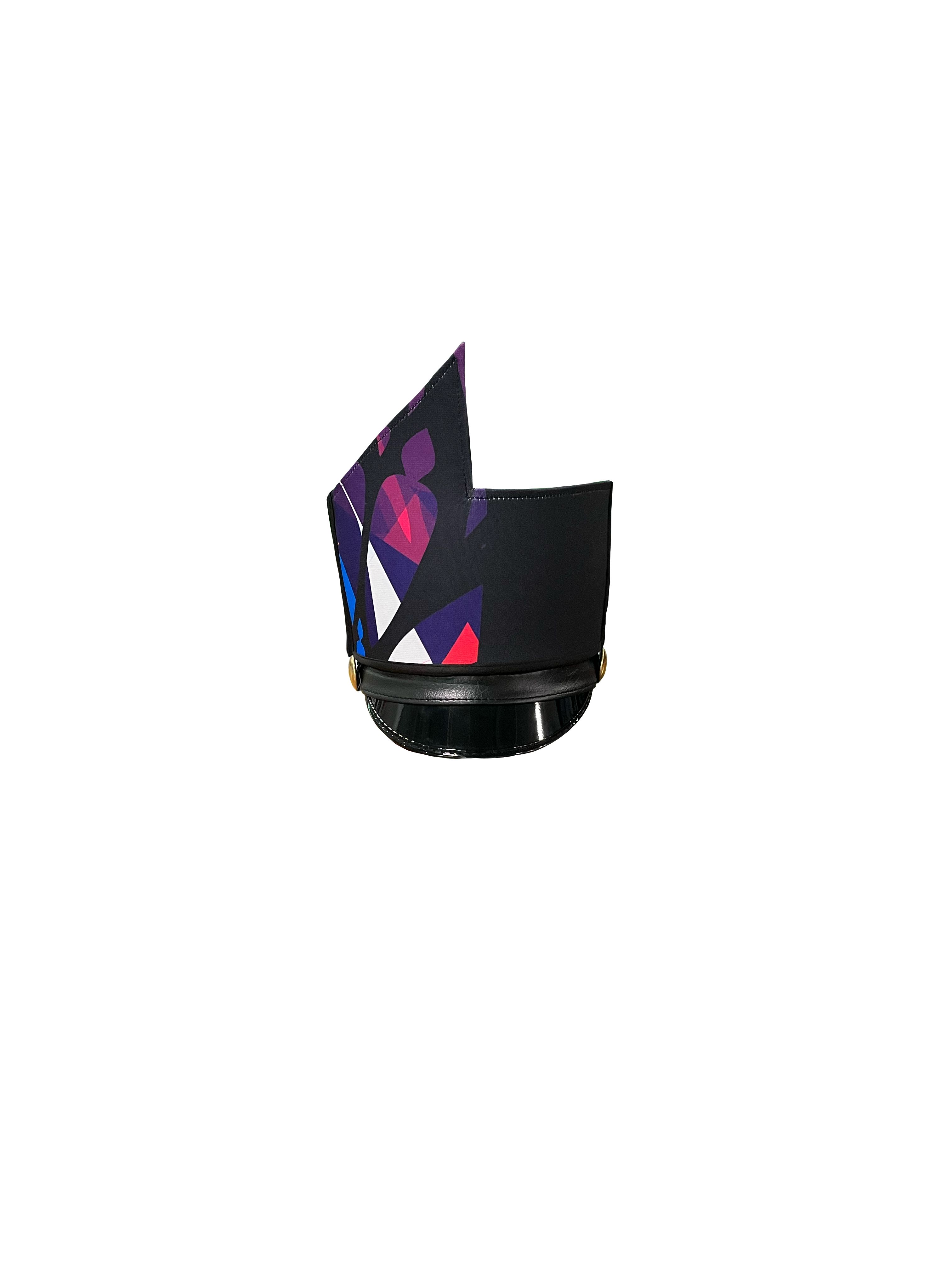 Complete your ensemble with this stunning shako wrap, featuring a vibrant multi-color stained glass design. The intricate geometric patterns and sleek black accents create a cohesive and captivating look that stands out on the field or stage.